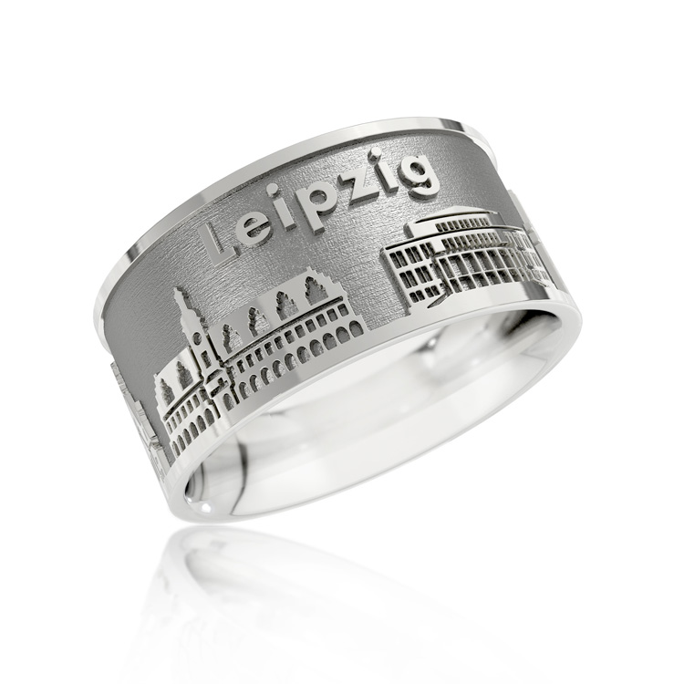 The silhouettes of the Nicolai Church, the new and old Town Hall, the St Thomas' Church, the Opera House, the Paulinum, the Reichsgericht (Imperial Court) building and a statue of Bach adorn this ring.