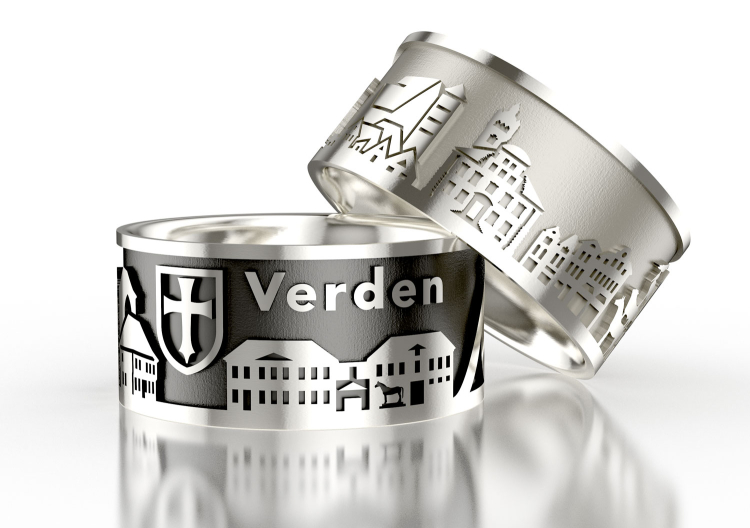 Die Silhouetten der Reiterstadt mit den traditionellen Wahrzeichen wie das Rathaus, die Altstadt, den Verdener Stadtmusikanten, das Scharfrichterhaus, das Wappen, das Pferdemuseum, die Aller-Weser-Region, Pferd und Reiter sowie der Dom St. Maria zieren den Ring.