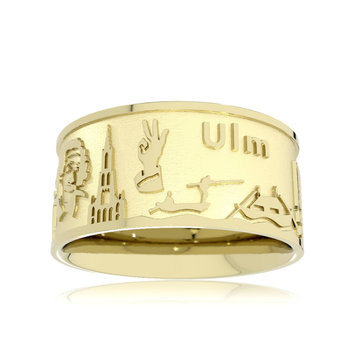 The silhouettes of the city with traditional landmarks such as the Stadthaus, the Ulm Sparrow, Einstein, Ulm Cathedral, Schwörmontag, the Fischerstechen, the Ulmer Schachtel, the Schiefe Haus, the Schneider von Ulm, the New Centre and the town hall adorn the ring. Real gold rings are always custom-made and therefore cannot be exchanged or returned. Prices may change due to daily gold price fluctuations.